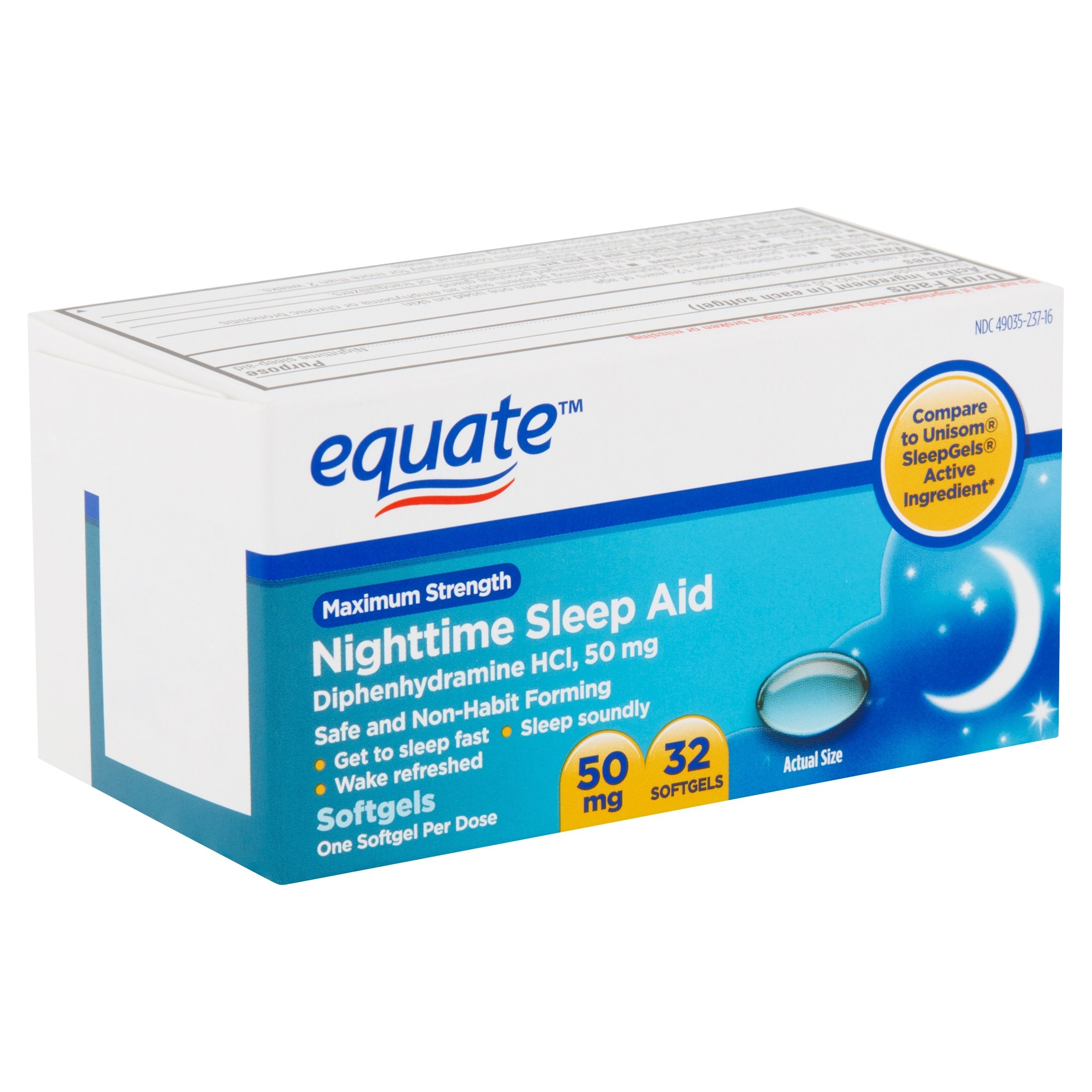 Equate Maximum Strength Nighttime Sleep Aid Softgels;  50 mg;  32 Count Equate Maximum Strength Nighttime Sleep Aid Softgels;  50 mg;  32 Count Equate Maximum Strength Nighttime Sleep Aid Softgels;  50 mg;  32 Count