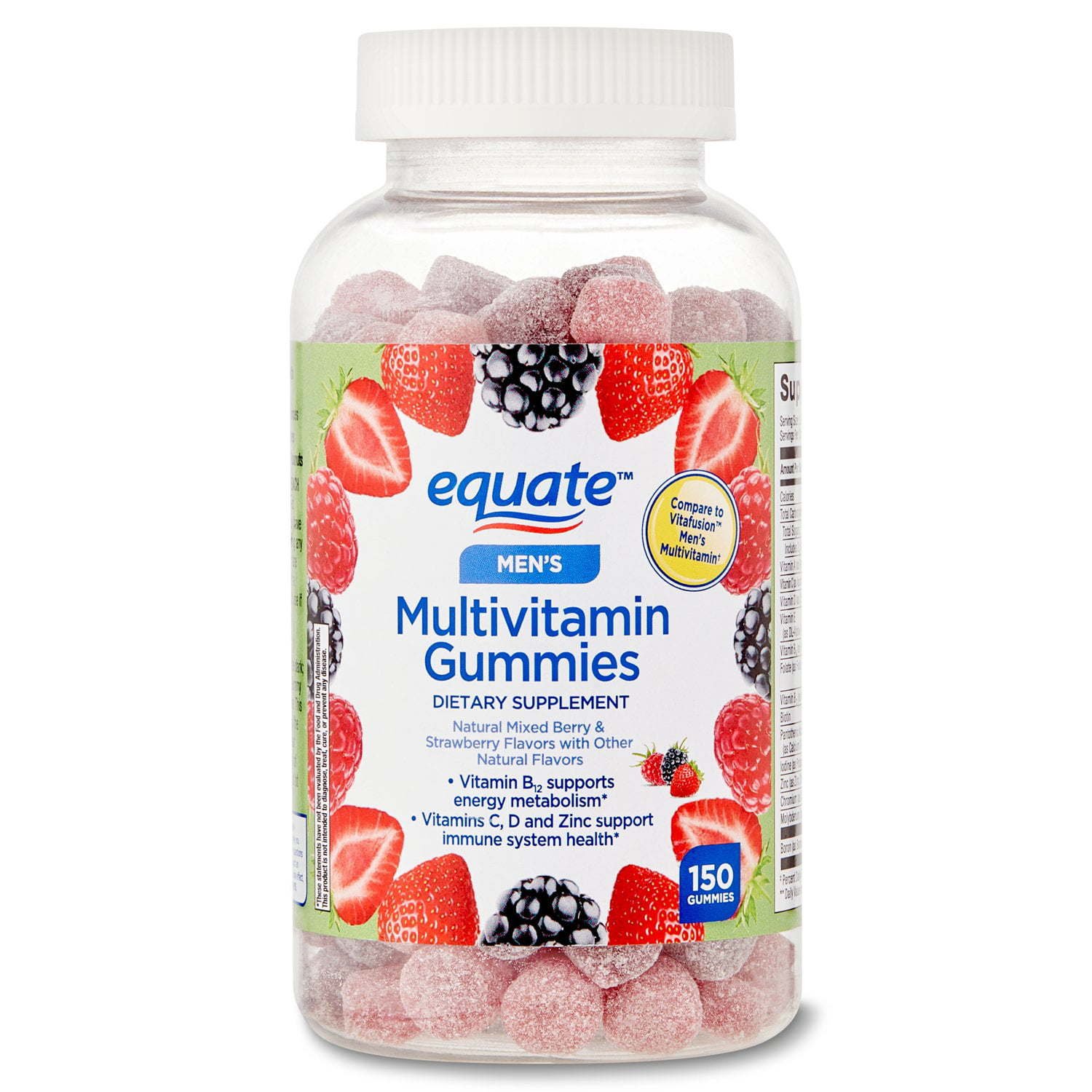 Equate Men's Multivitamin Gelatin Gummies; 150 Count are the simplest; best-tasting way to promote good health and provide your body with the vitamins and minerals it needs. With flavors including mixed berry and strawberry; these delicious and easy to chew gummies make taking your daily multivitamin a joy.