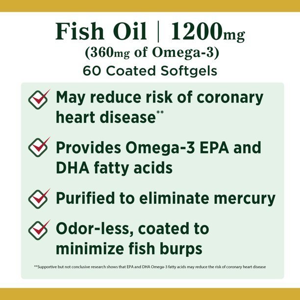 Nature's Bounty Fish Oil 1200 Fish Oil Contains Epa And Dha Which Help Support And Maintain The Health Of Your Cardiovascular And Circulatory System.* Omega-3 Fatty Acids Are Considered 'Good' Fats And Help Maintain Triglyceride Levels Already Within A Normal Range.* Odorless Fish Oil Is Coated To Minimize The Aftertaste And Fish Burps!