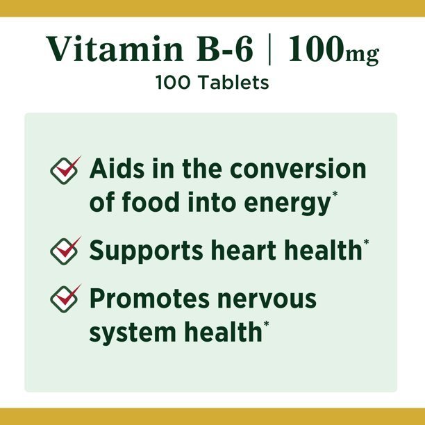 Nature's Bounty Vitamin B-6 100mg tablets support energy production by helping convert food into energy.* Nature's Bounty B-6 plays a role in heart health by promoting healthy homocysteine levels already within a normal range; while also supporting nervous system health.* Nature's Bounty Vitamin B-6 tablets are Non-GMO and gluten-free.