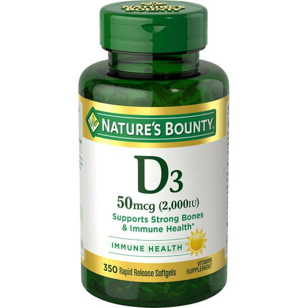 Support strong bones and immune health with Nature’s Bounty Vitamin D softgels.* We use Vitamin D3; a more potent form of Vitamin D that is an essential nutrient for immune support and may assist the immune system by helping to regulate T and B-lymphocytes (cells that are major components of your immune response).* Also called the 'sunshine vitamin; ' Vitamin D is naturally formed in the body through exposure to sunshine. However; many people don’t get enough of it due to living and working indoors; especially during the colder winter months. With 2000 IU of Vitamin D per serving; Nature’s Bounty Vitamin D rapid-release softgels are an easy way to help supplement Vitamin D production in the body.* For additional wellness support; Nature’s Bounty Vitamin D helps maintain healthy bones in adults; as Vitamin D3 assists the body with calcium absorption.* As a bonus; Nature’s Bounty Vitamin D softgels are non-GMO; free of gluten and sugar; and contain no artificial colors or sweeteners.