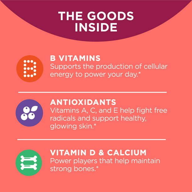 OLLY Women’s Multi gummies are delicious, scientifically formulated, gluten free gummy vitamins.Our Blissful Berry gummy vitamins for women are packed with key nutrients to nourish you daily so you can keep doing your thing. This womens multivitamin blend features B Vitamins to support cellular energy production, Vitamin D to boost bone health plus Vitamins A, C & E. The chewable daily vitamins are a powerful blend for overall wellness and to help fill the gaps when your eating habits are a little less than perfect.*Good health is at the center of everything we do. That's why we’ve made it our mission to make nutrition easy to understand. We do it by crafting products that are as effective as they are delicious—because we know when something feels good, you’re more likely to do it.**These statements have not been evaluated by the Food and Drug Administration. This product is not intended to diagnose, treat, cure or prevent any disease.