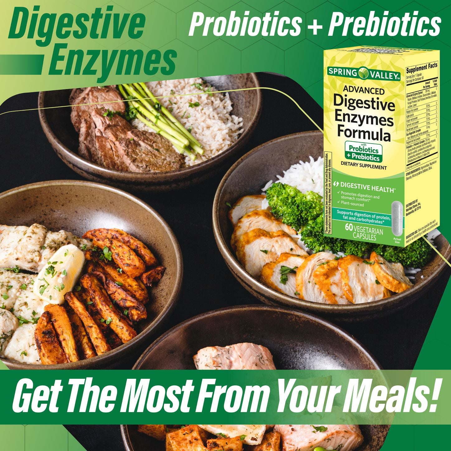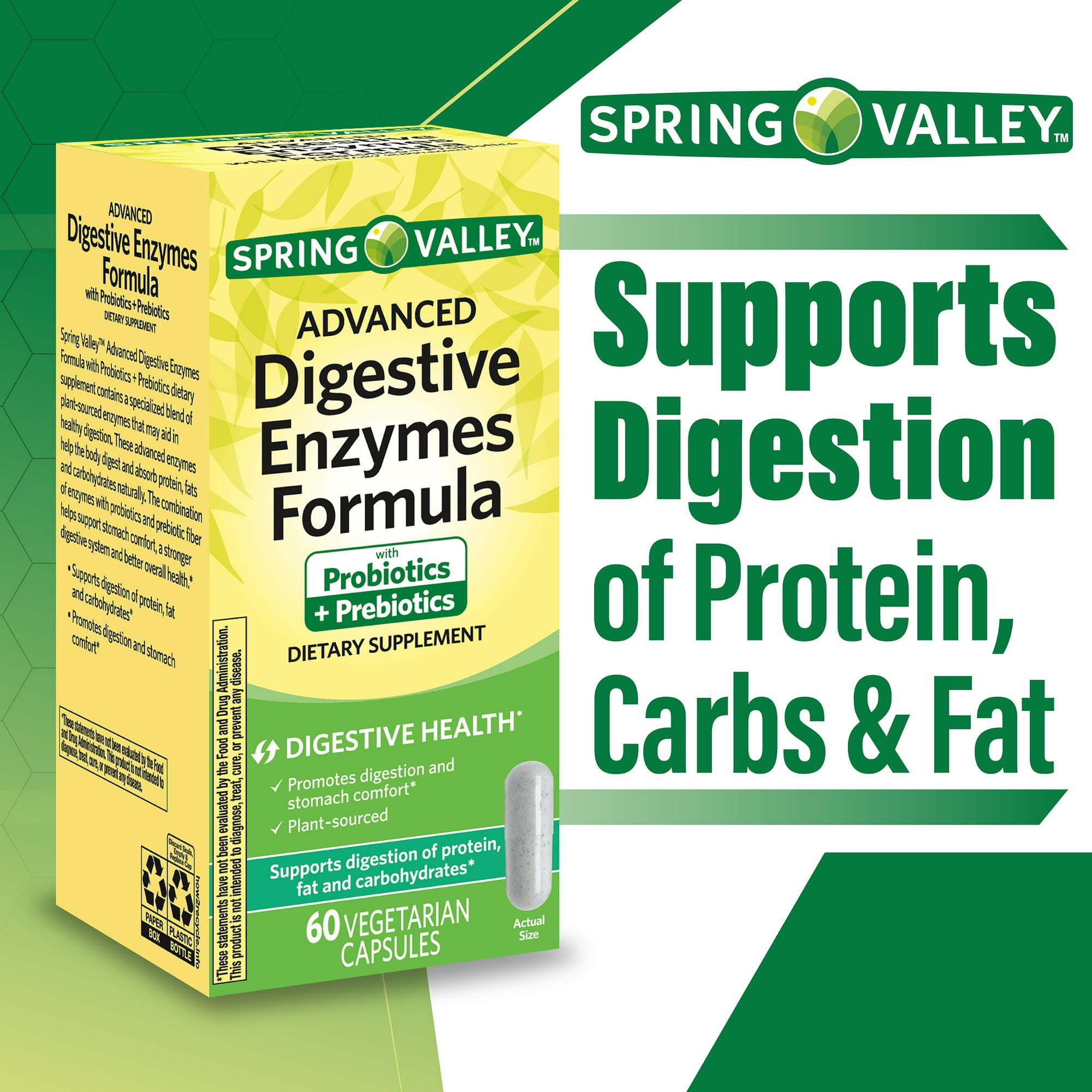 By combining these digestive enzymes with five potent probiotics and the finest prebiotic fiber; Spring Valley Advanced Digestive Enzymes Capsules are designed to help support stomach comfort; a stronger digestive system and better overall wellness. They are also fortified with added papaya; apple; ginger; turmeric and other key natural digestive superfoods. Each capsule is plant-sourced and contains no artificial colors or flavors; added sugar; lactose or dairy. Get the digestive support you need with Spring Valley Advanced Digestive Enzymes Capsules.