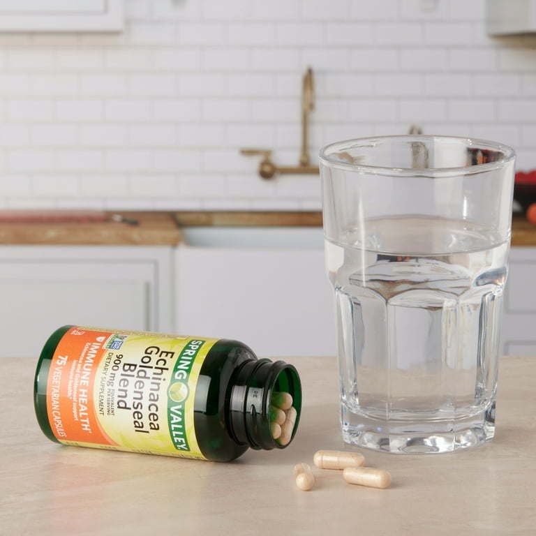 Our Spring Valley Echinacea Goldenseal Blend Dietary Supplement, 900 mg may help support your immune health. These vegetarian capsules contain no gluten, yeast, wheat, milk or milk derivatives, lactose, preservatives, soy, artificial color, or artificial flavor. The recommended dosage is two capsules daily, preferably taken with a meal. You can rest assured that Spring Valley Echinacea Goldenseal Blend Dietary Supplement, 900 mg is produced with strict quality guidelines and is backed by our quality guarantee.