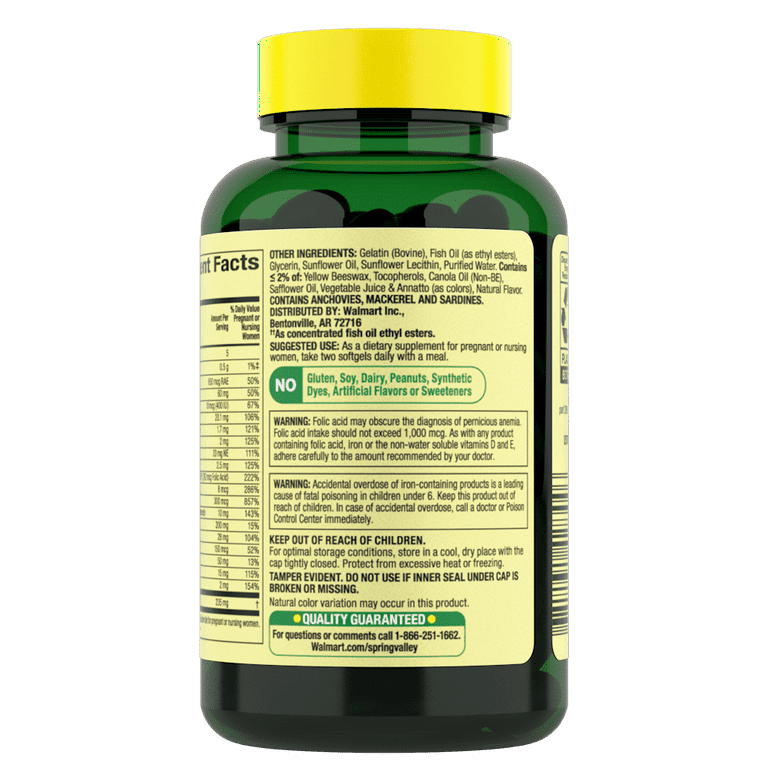 Spring Valley Mini Prenatal Multi + DHA Complete Multivitamin/Multimineral Supplement Mini Softgels are here to help support prenatal health before, during, and after pregnancy.* Each serving contains 18 essential vitamins and minerals, along with Omega-3 Fatty Acids EPA and DHA (1) all in easy to swallow "minis" softgels. The omega-3 EPA and DHA (1) help support a baby's brain and eye development, while the 200 percent of your daily value of folate helps to support fetal spinal column development.* These softgels are free from gluten, soy, dairy, peanuts, synthetic dyes, artificial flavors, and sweeteners. The suggested does is two softgels with a meal for pregnant and nursing women. Support your prenatal health with the Spring Valley Mini Prenatal Multi + DHA Complete Multivitamin/Multimineral Supplement Mini Softgels.