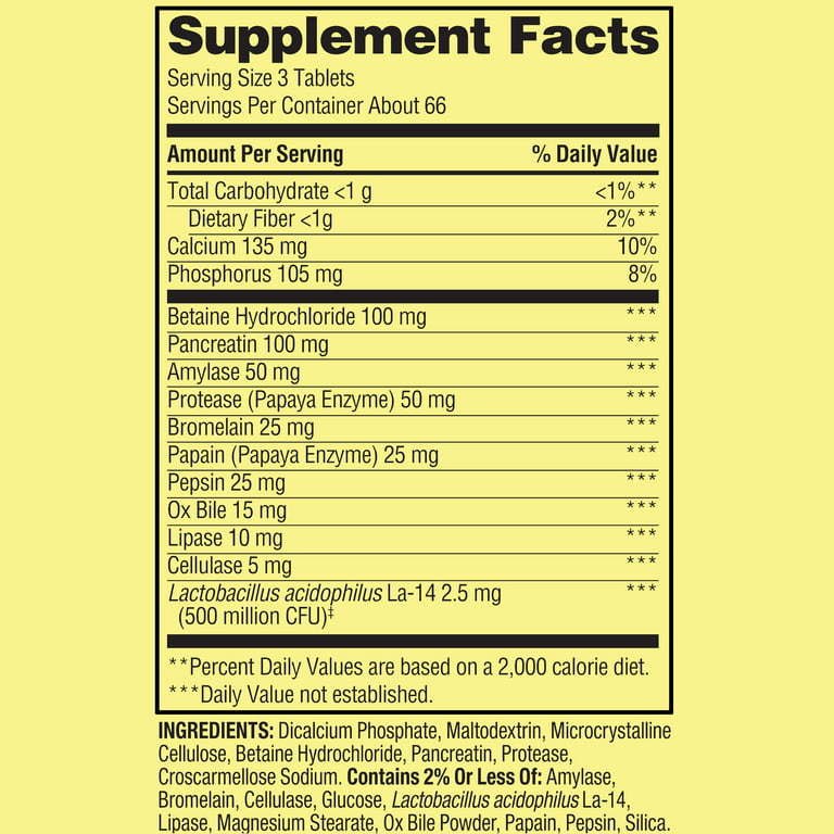 Our Spring Valley Probiotic Multi-Enzyme Digestive Formula Tablets with probiotic acidophilus is formulated to promote healthy digestion.* It contains a combination of digestive enzymes such as betaine hydrochloride, pancreatin, amylase, protease (papaya enzyme), bromelain, papain (papaya enzyme), pepsin, ox bile, lipase, cellulase, and friendly bacteria lactobacillus acidophilus La-14. These tablets contain no artificial colors or flavors, artificial sweeteners, preservatives, egg, high fructose corn syrup, lactose, milk or milk derivatives, peanuts, sodium (less than 5 milligrams), fish, shellfish, talc, or trans fat. The recommended adult dosage is three tablets daily with food. You can rest assured that Spring Valley Probiotic Multi-Enzyme Digestive Formula Tablets Dietary Supplement is produced with strict quality guidelines and is backed by our quality guarantee.