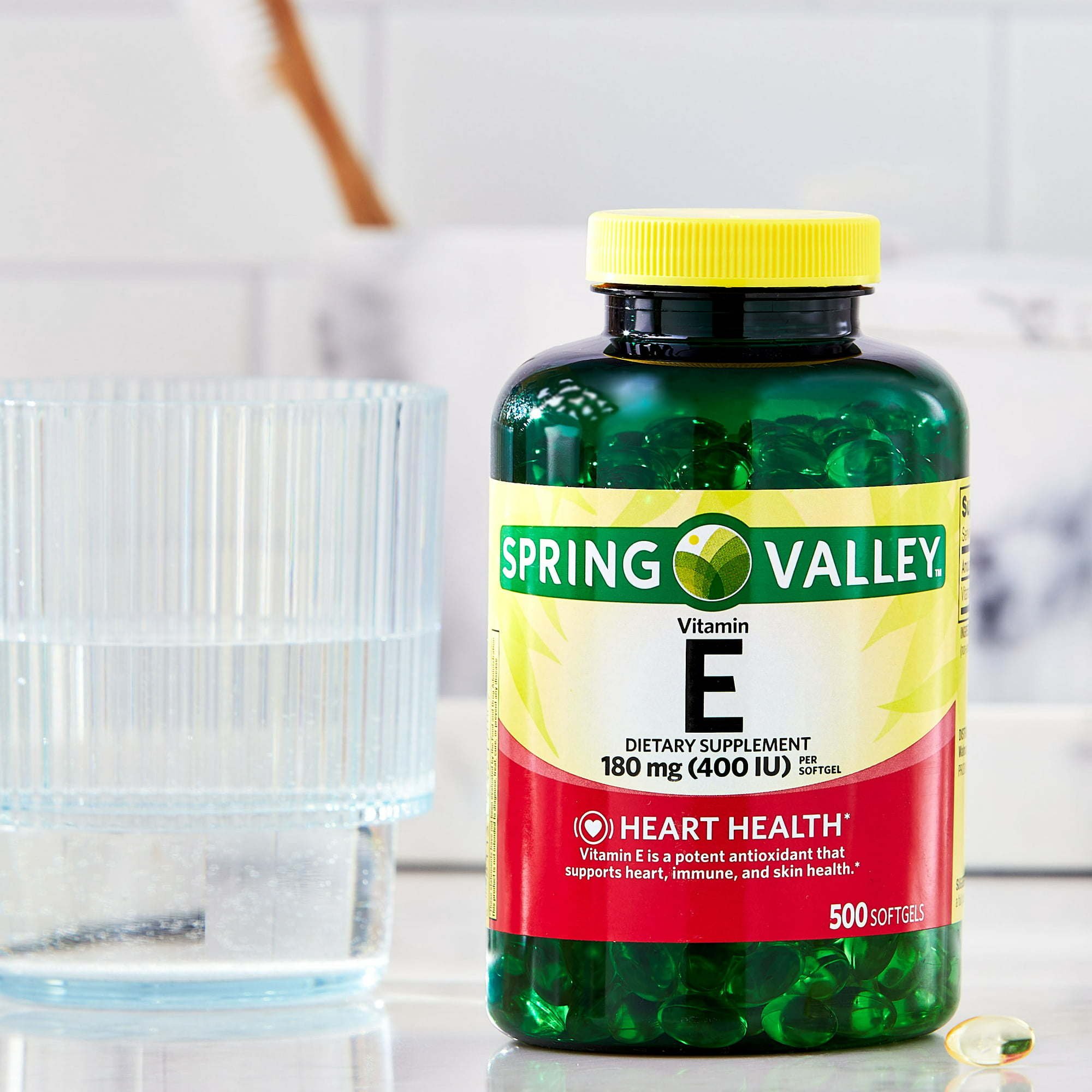 Our Spring Valley Vitamin E Dietary Supplement; 180 mg is a dietary supplement that may support heart; immune; and skin health. This supplement contains no gluten; lactose; added preservatives; added colors; flavors; or salt. The recommended dosage is 1 softgel per day with a full glass of water; preferably after a meal. You can rest assured that our Spring Valley Vitamin E Dietary Supplement; 180 mg is produced with strict quality guidelines and is backed by our quality guarantee.