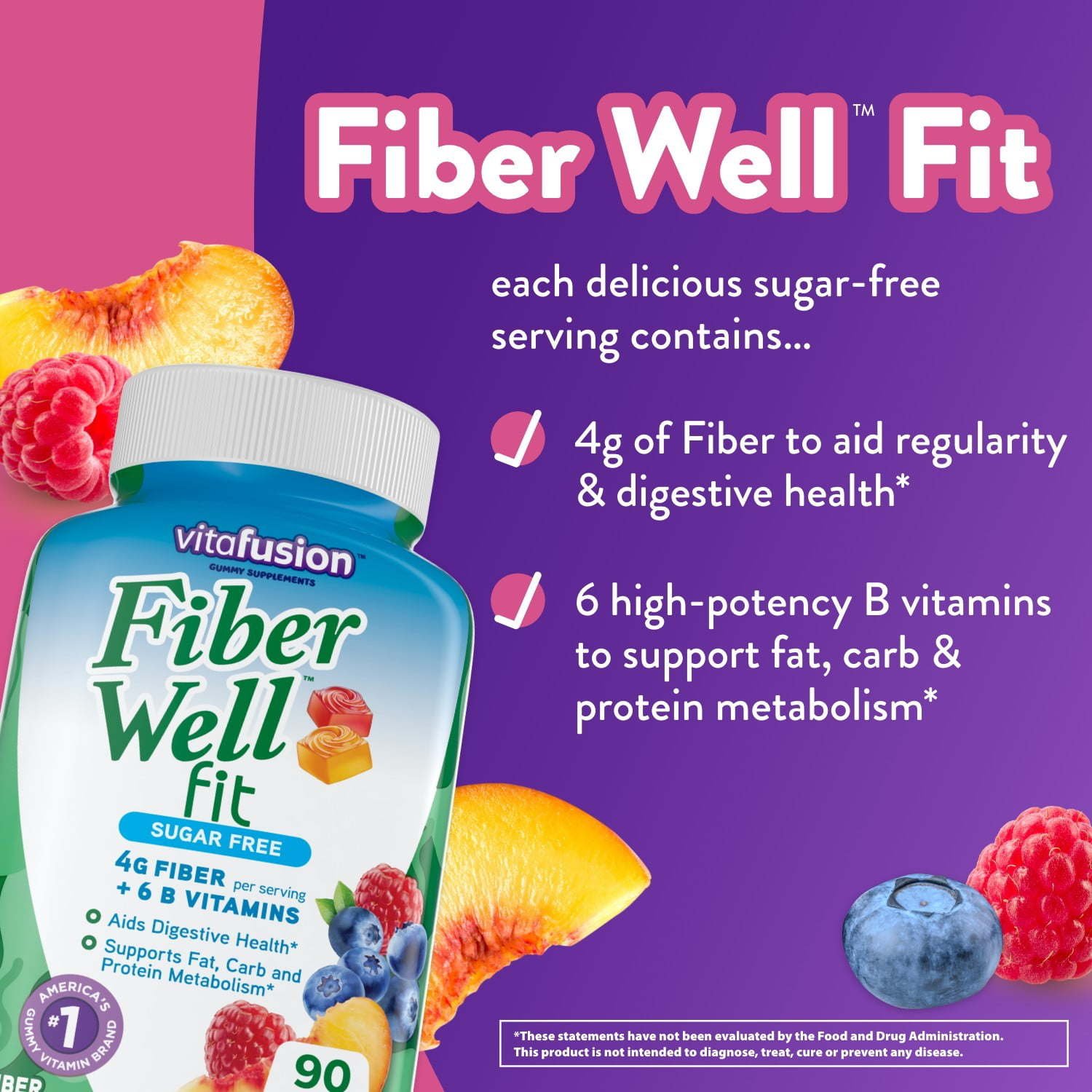 These vitafusion Fiber Well Fit Gummy Supplements are high fiber vitamins that help you get the fiber you may need to support digestive health. Each delicious; sugar-free gummy serving gives you 4 grams of prebiotic fiber; plus the added benefit of six B vitamins to support the metabolism of fat; carbs; and proteins. 1 Fiber Well Fit comes in delicious; natural peach; raspberry; and berry flavors; so you can enjoy your fiber supplement. Each high fiber gummy serving contains: 4 grams of fiber vitamins for digestion for those needing a high fiber diet and weight loss 1 and six high potency B vitamins to support fat; carb and protein metabolism for cellular energy 1. At vitafusion; we believe taste and nutrition can be fused together to deliver vitamins to aid digestion; ensuring these gummy fiber supplements are an easy and delicious part of your day. For over 12 years; we’ve been helping people to live happy and healthy lives with our gummy vitamins and supplements. Anything is possible when great nutrition is your foundation. Take a fruitful step toward a healthier; happier world with America’s #1 gummy vitamin brand. Try vitafusion Fiber Well Sugar Free Gummies today. Vitamin Better! 1 These statements have not been evaluated by the Food and Drug Administration. This product is not intended to diagnose; treat; cure or prevent any disease.